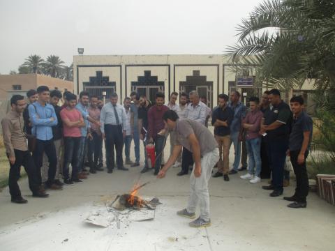 لتفعيل الجوانب التربوية والنشاطات اللاصفية وكأجراءات توعوية ووقائية قام قسم شؤون الاقسام الداخلية في جامعتنا باجراء ممارسات لاطفاء الحرائق بافتعال حرائق بسيطة و شارك بمعالجتها واطفاءها عدد من الطلبة والطالبات والمشرفين والمشرفات في مجمعات الاقسام الداخلية و رافق ذلك شرح لانواع الحرائق والمطافئ