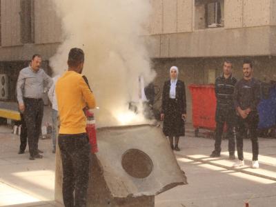 لتفعيل الجوانب التربوية والنشاطات اللاصفية وكأجراءات توعوية ووقائية قام قسم شؤون الاقسام الداخلية و بالتعاون مع شعبة الدفاع المدني و قسم المتابعة في جامعتنا باجراء ممارسات لاطفاء الحرائق بافتعال