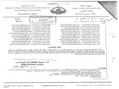 نظرا للجهود المبذولة في تنفيذ اعمال الصيانة الصيفيه في مجمعي الجادرية و الكاظمية لطلبة الاقسام الداخلية والحرص